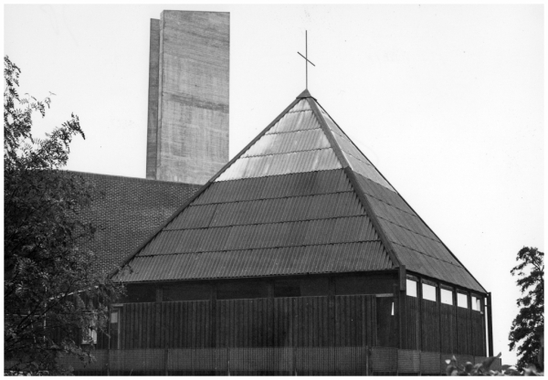I söndags - den 11 juni - var det 50 år sedan Hammarbykyrkan invigdes. Men inte den nuvarande byggnaden utan en monteringsfärdig s k vandringskyrka som uppfördes på det nuvarande parkeringsdäcket. Den togs alltså i bruk den 11 juni - också en söndag - och användes tills vår nuvarande kyrkobyggnad invigdes i oktober 1969. Vandringskyrkan flyttades 1970 till Tumba och blev där en del av Broängskyrkan.