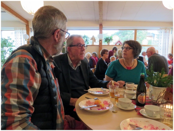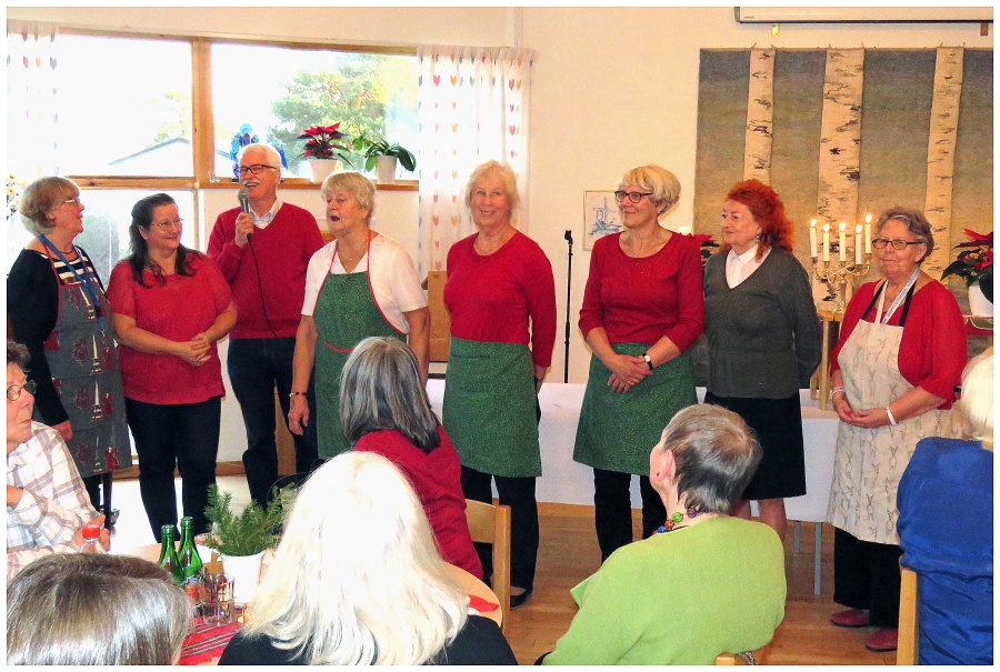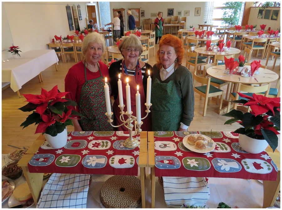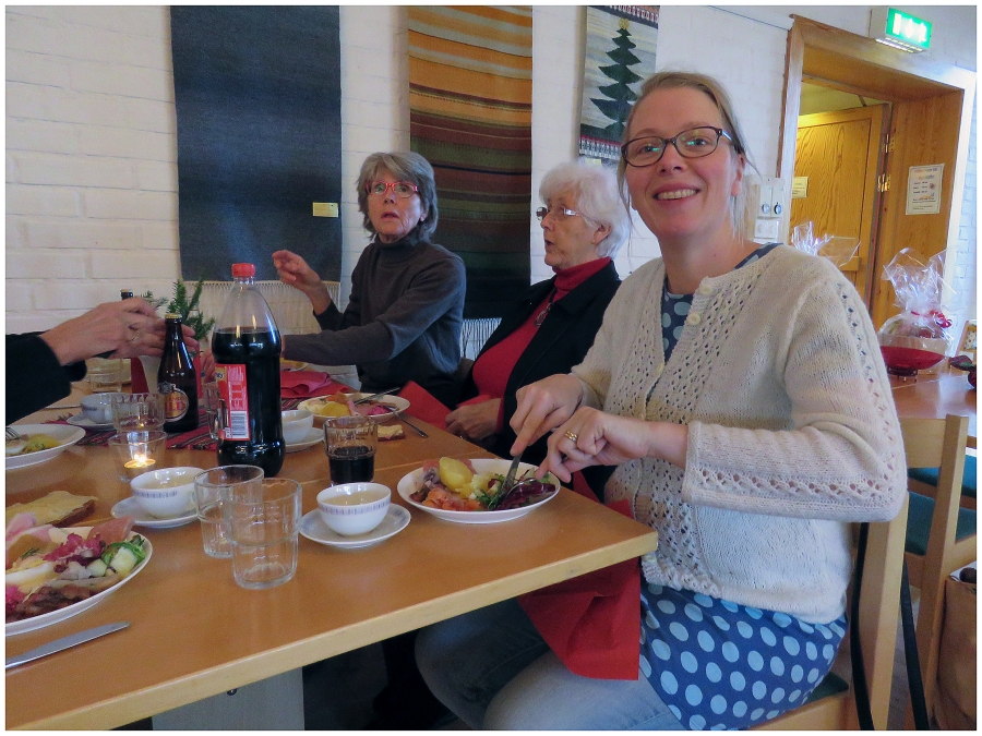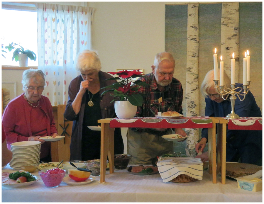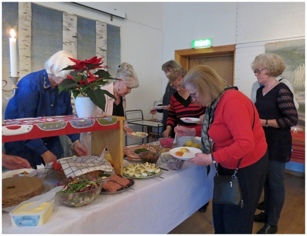 Varje år i december är det julbord i Hammarbykyrkan. I år hölls julbordet onsdag den 9/12. Bakom arrangemanget står ett antal äldre damer med Gertrud Häger och Gerd Lithner i spetsen. I år var vi ca 60 personer som fick del av sillen, skinkan, frestelsen och allt annat som hör till ett riktigt julbord. Allt till det facila priset av 120 kr. Webbredaktören var alltså på plats och passade på att bildmässigt dokumentera händelsen.