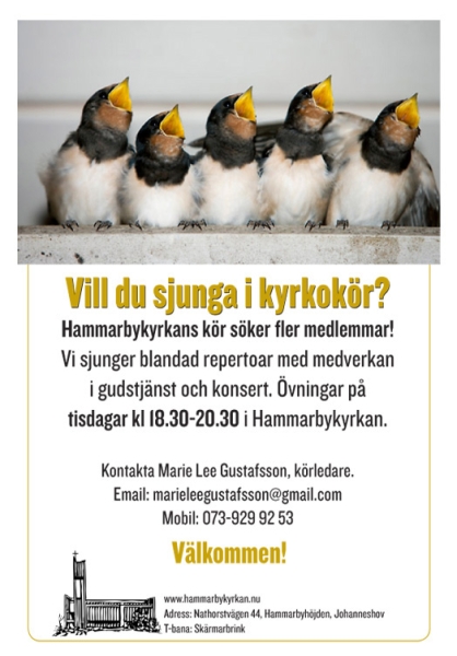 Hammarbykyrkans kör söker fler medlemmar. Kören över tisdagar kl 18.30 till 20.30. Körledare är Marie Lee Gustafsson. Kören är fyrstämmig, har en blandad repertoar och medverkar i gudstjänster och konserter.
