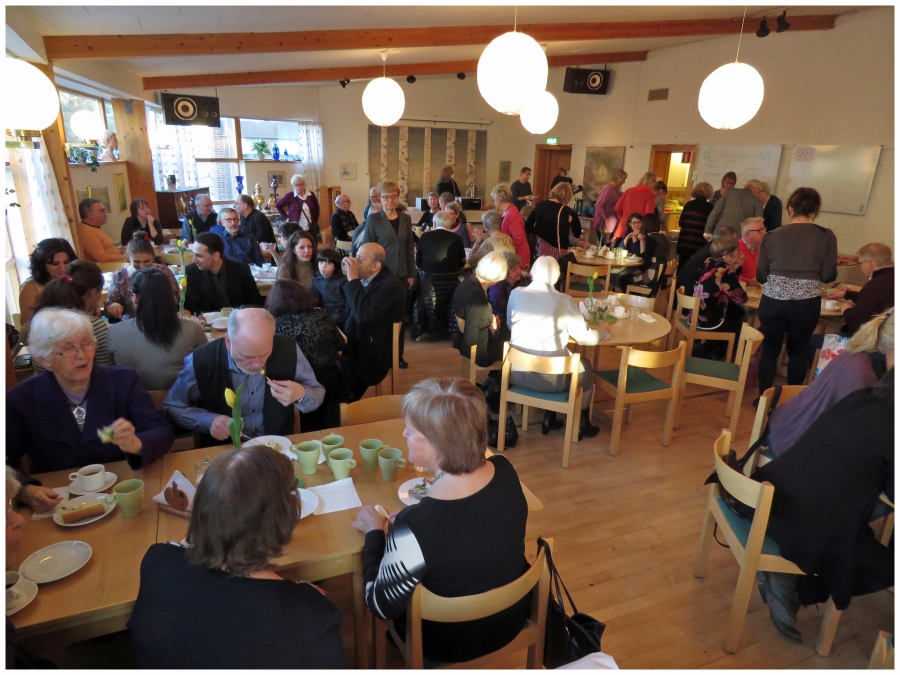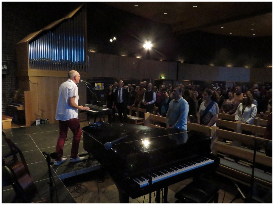 Kl 18 bänkade vi oss i Hammarbysalen. Ulf Perbo och Sarah (från den persiska gruppen i kyrkan) var kvällens värdpar och hälsade oss alla välkomna. Ulf tog till och med fram dragspelet och ledde oss i Ingemar Olssons näst mest spelade låt på Spotify, den som handlar om en rak banan.